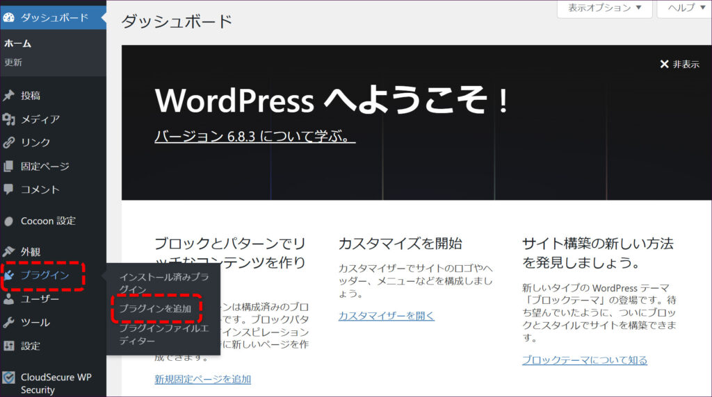 まずは、Contact Form 7をWordPressにインストールします。WordPressの管理画面にログインし、左側のメニューから「プラグイン」→「プラグインを追加」をクリックします。