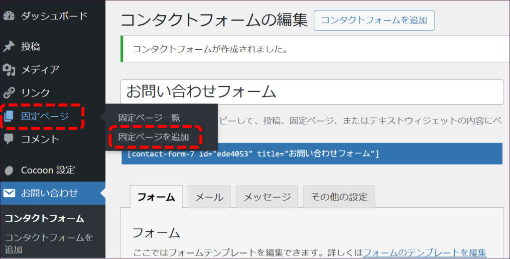 画面左メニューから「お問い合わせ」→「コンタクトフォーム」をクリックします。