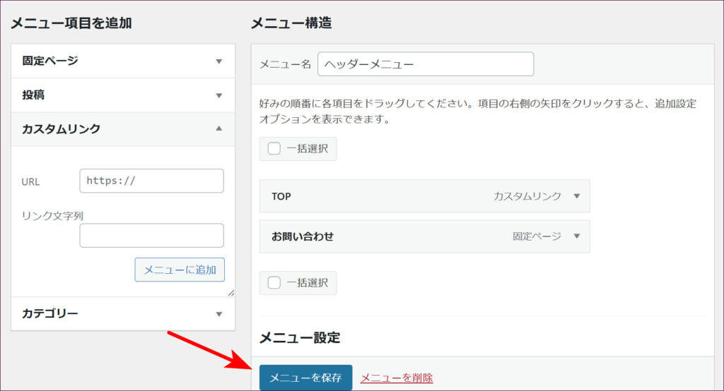 配置の設定が終わったら「メニューを保存」をクリックします。