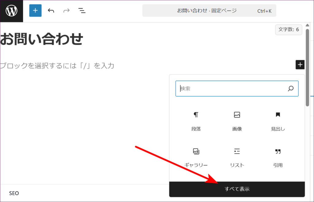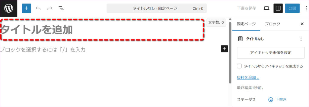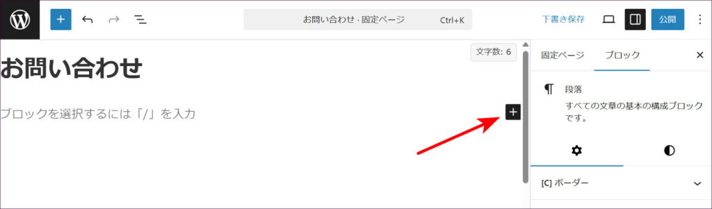 「タイトルを追加」と書かれた入力エリア(ページタイトル)に、「お問い合わせ」などと入力します。