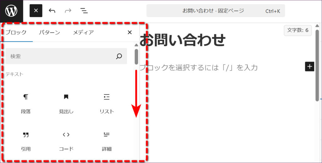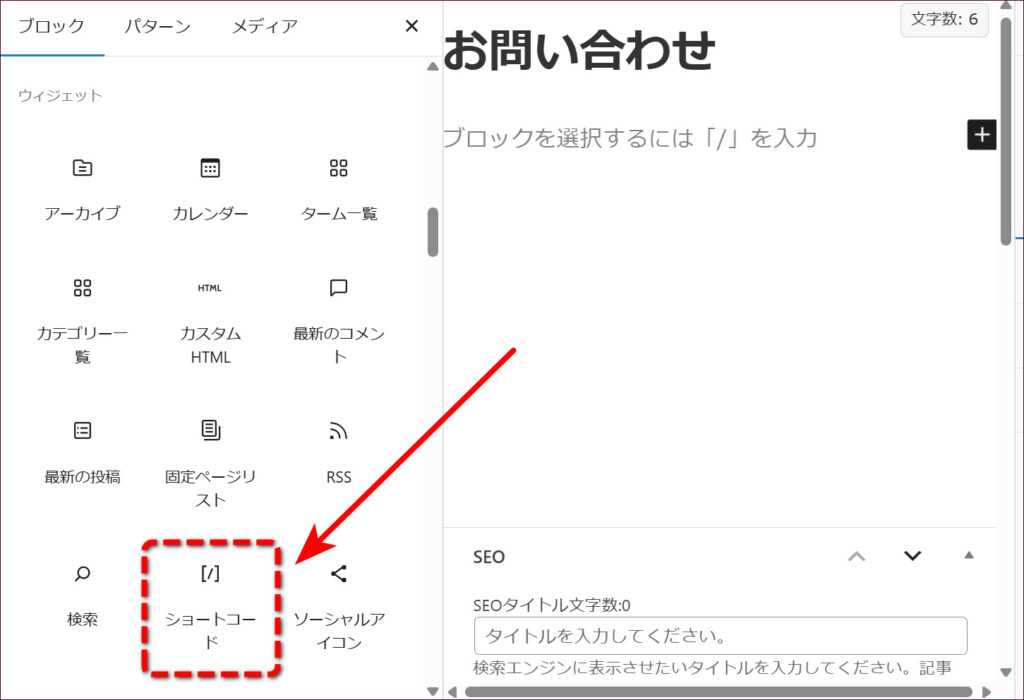 画面左側にブロックの一覧が表示されるので、下にスクロールして「ショートコード」ブロックを探します。