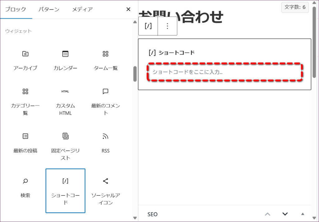 「ショートコード」の入力欄に、先ほどコピーしたコードを貼り付けます。