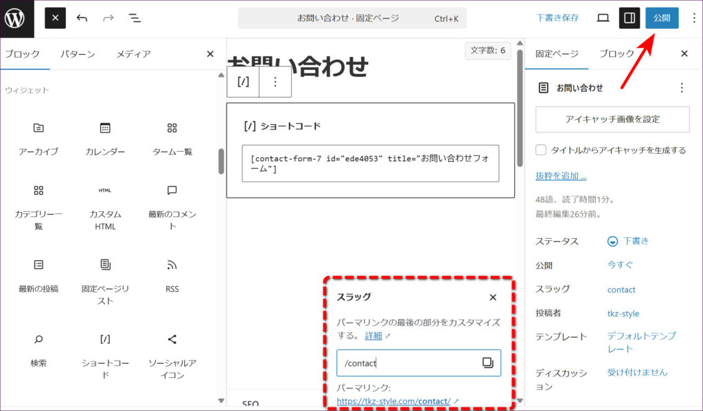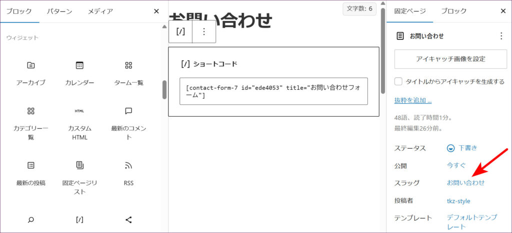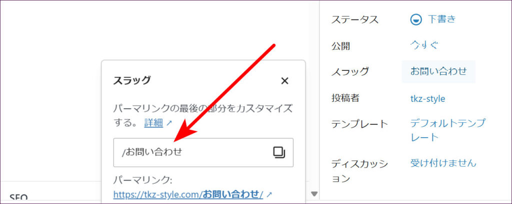 スラッグの入力欄に、ページのURLとして使いたい文字列を、英数字で入力します。ページの内容を表すものがよいとされていますので、今回は「contact」と入力します。