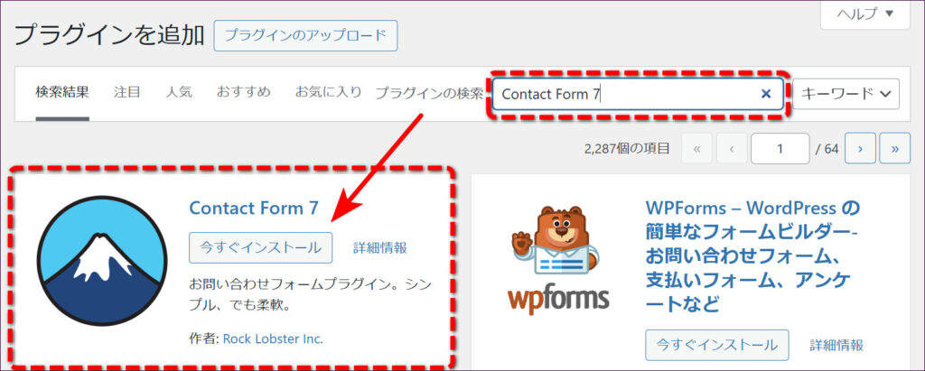 プラグインの追加画面が表示されたら、検索窓に「Contact Form 7」と入力します。すると、Contact Form 7が検索結果に表示されるので、「今すぐインストール」をクリックします。