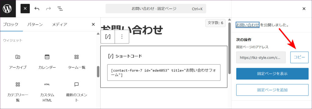これで、お問い合わせフォームが設置されたページが完成しました。「コピー」ボタンをクリックしてページのアドレス(URL)をコピーし、メモ帳などに控えておくと、プロフィールページやプライバシーポリシーにリンクを貼る際に便利です。