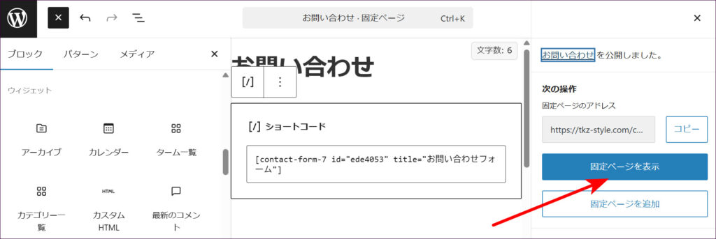 「固定ページを表示」をクリックして、実際のページを確認してみましょう。
