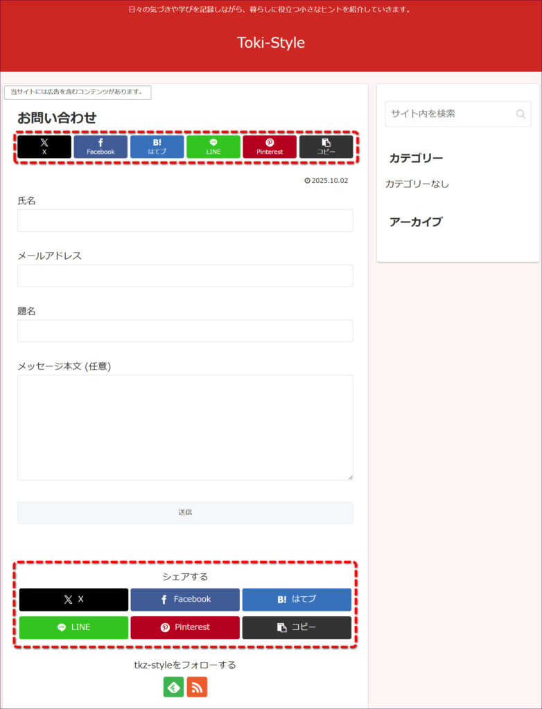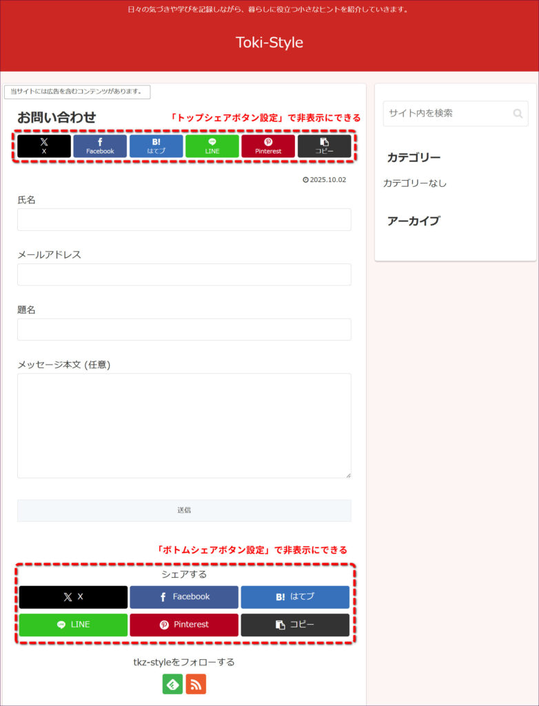 「お問い合わせフォーム」などの「固定ページ機能」で作成するページは、通常、シェアされることはほとんどないので、表示されるシェアボタンが邪魔に感じる方もいらっしゃるかもしれません。