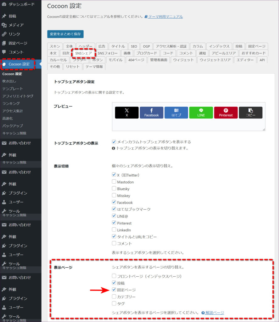 使用しているテーマが「Cocoon」であれば、「Cocoon設定」→「SNSシェア」で固定ページのシェアボタンを非表示にできます。