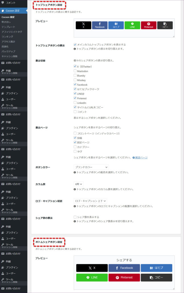 また、シェアボタンの設定画面は「トップシェアボタン設定」と「ボトムシェアボタン設定」の2つに分かれています。