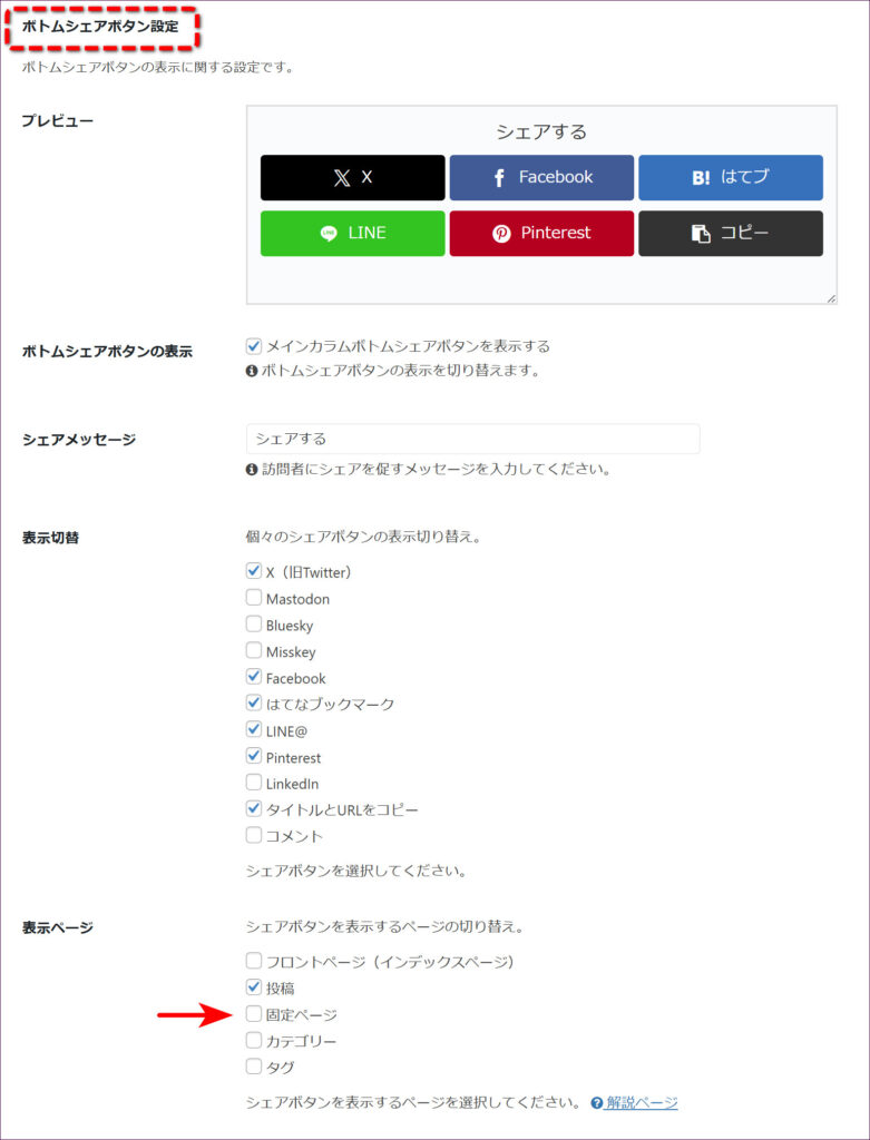 ページ下部のシェアボタンもはずしたい場合は、さらに「ボトムシェアボタン設定」の「表示ページ」項目まで画面を下にスクロールさせて、「固定ページ」のチェックをはずしておきましょう。