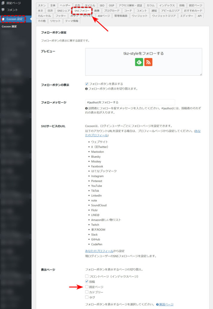 「SNSフォロー」→「表示ページ」のチェックをはずすと非表示になります。