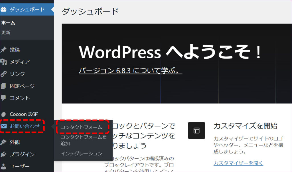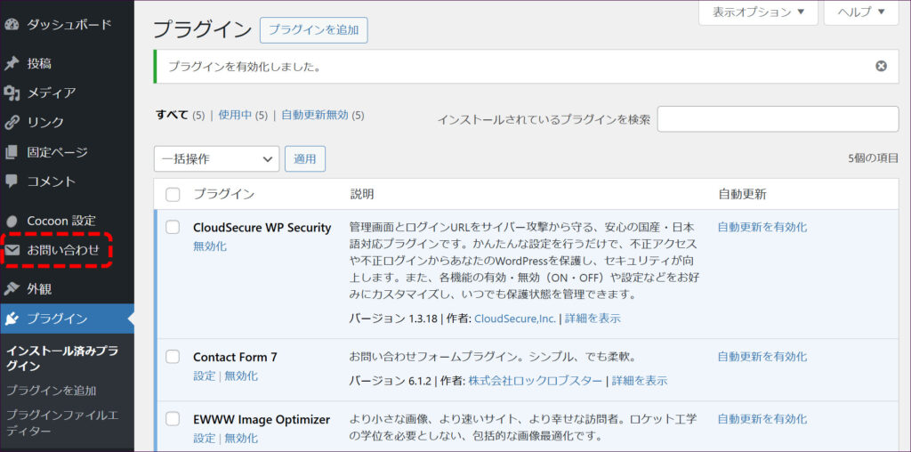 これで、Contact Form 7を使う準備が整いました。管理画面の左メニューに「お問い合わせ」という項目が追加されます。