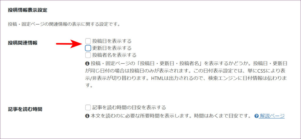 こちらも「投稿者名」と同じく、非表示にすると「投稿」機能で作成するブログ記事やコラム記事、レビュー記事なども日付が表示されなくなります。