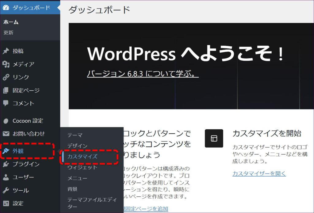 「追加CSS」の機能を使うには、まず画面左側「外観」→「カスタマイズ」をクリックします。