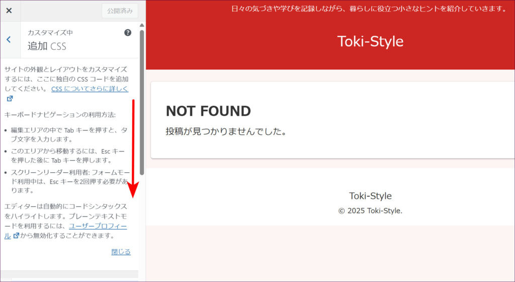 「追加CSS」の画面が表示されたら、画面左側を下にスクロールさせます。