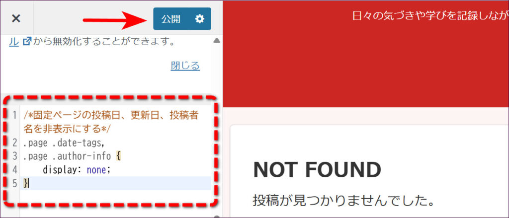 具体的な手順としては、以下のCSSコードを入力して、「公開」ボタンをクリックすると、固定ページの投稿日、更新日、投稿者名が非表示になります。