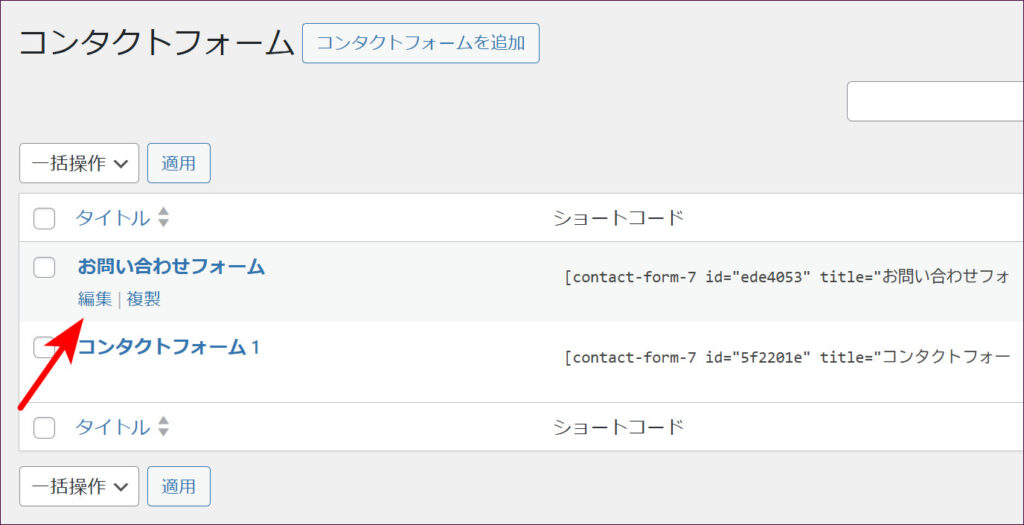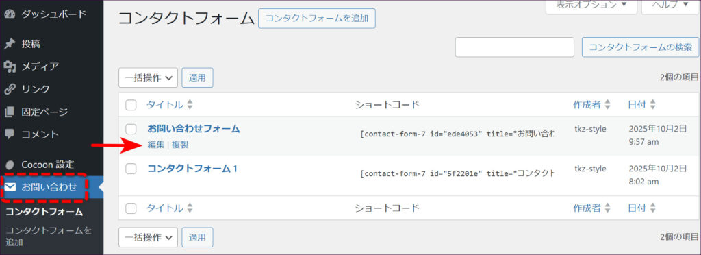 管理画面左メニュー「お問い合わせ」をクリックして、コンタクトフォームの一覧画面を開き、設定したいフォームの「編集」をクリックします。