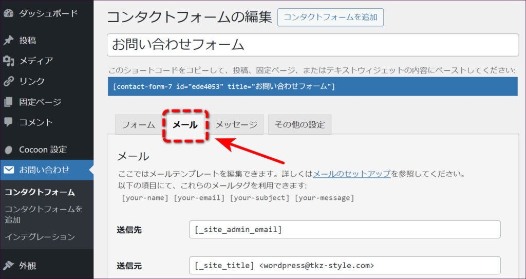 コンタクトフォームの編集画面が表示されたら、「メール」タブをクリックします。