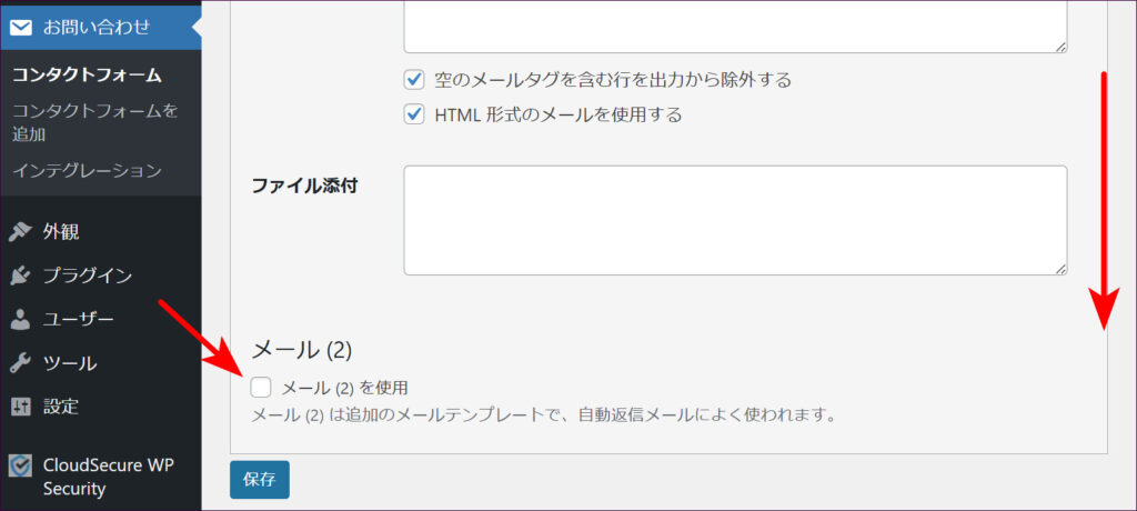 画面を下にスクロールし、「メール(2)を使用」にチェックを入れます。
