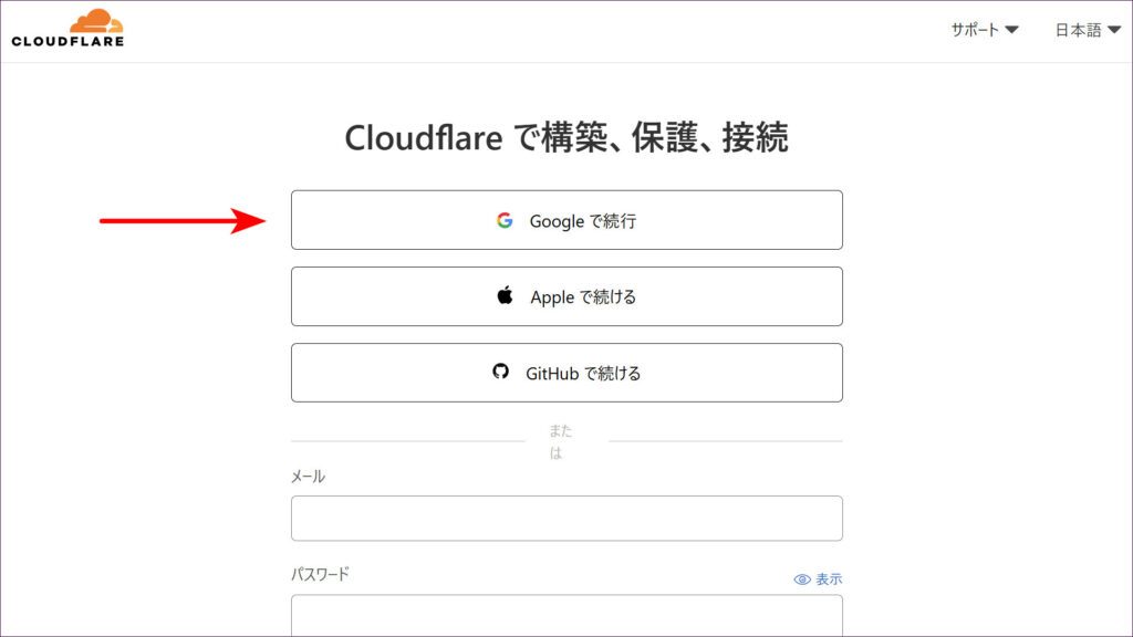 まずはじめに、Cloudflareの公式サイト(https://dash.cloudflare.com/sign-up)にアクセスし、アカウントを登録します。