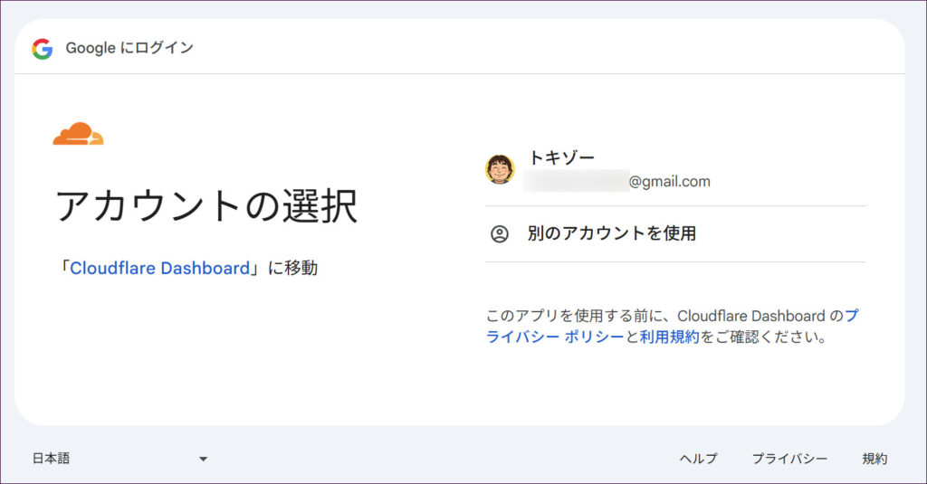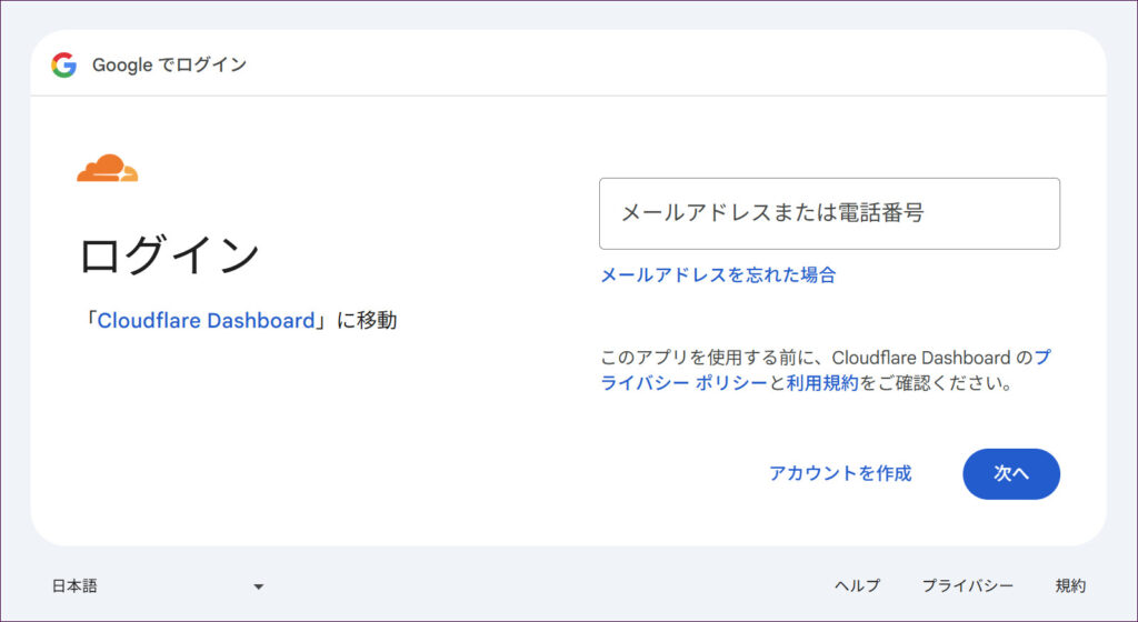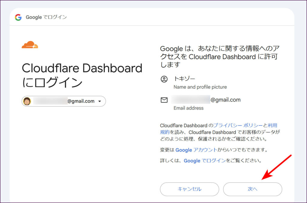 続いて、CloudflareがGoogleアカウントの基本情報(名前やメールアドレスなど)にアクセスするための許可画面が表示されますので、「次へ」をクリックします。