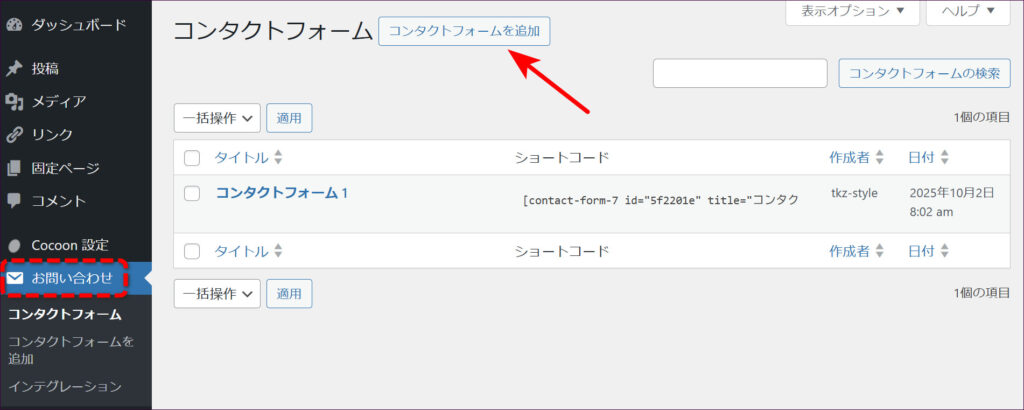 管理画面の「お問い合わせ」をクリックすると、コンタクトフォームの一覧画面が表示されます。「コンタクトフォーム1」というサンプルが最初から用意されていますが、今回は新しく作ってみましょう。「コンタクトフォームを追加」をクリックします。