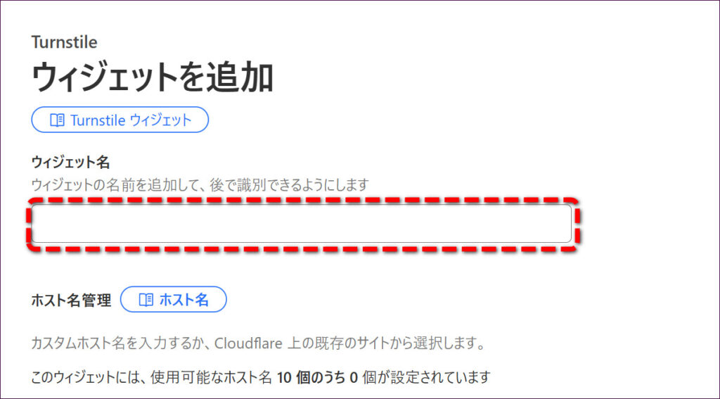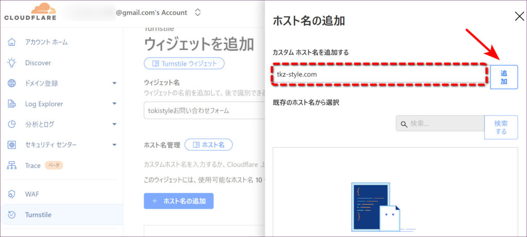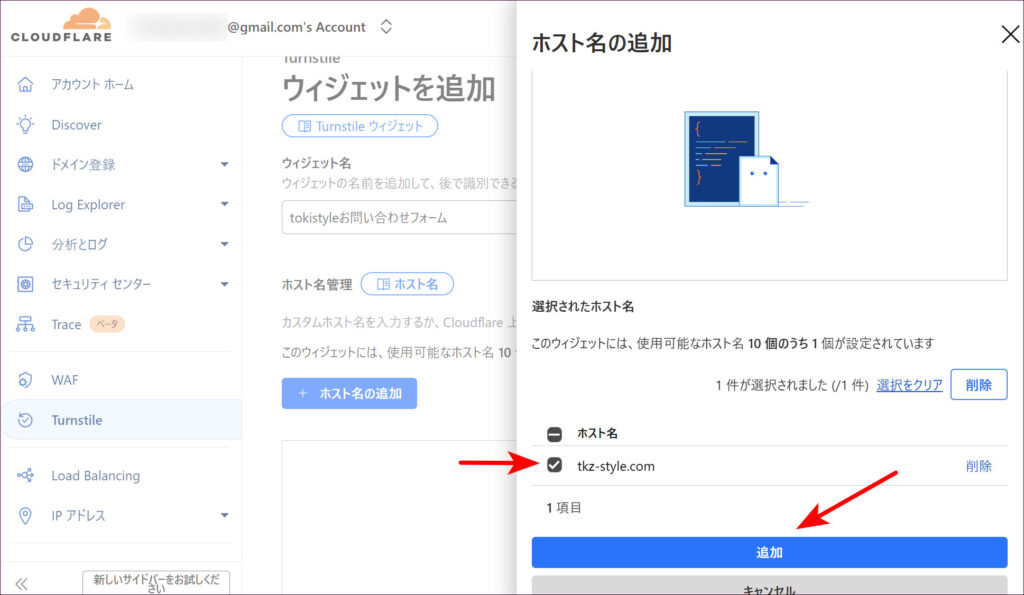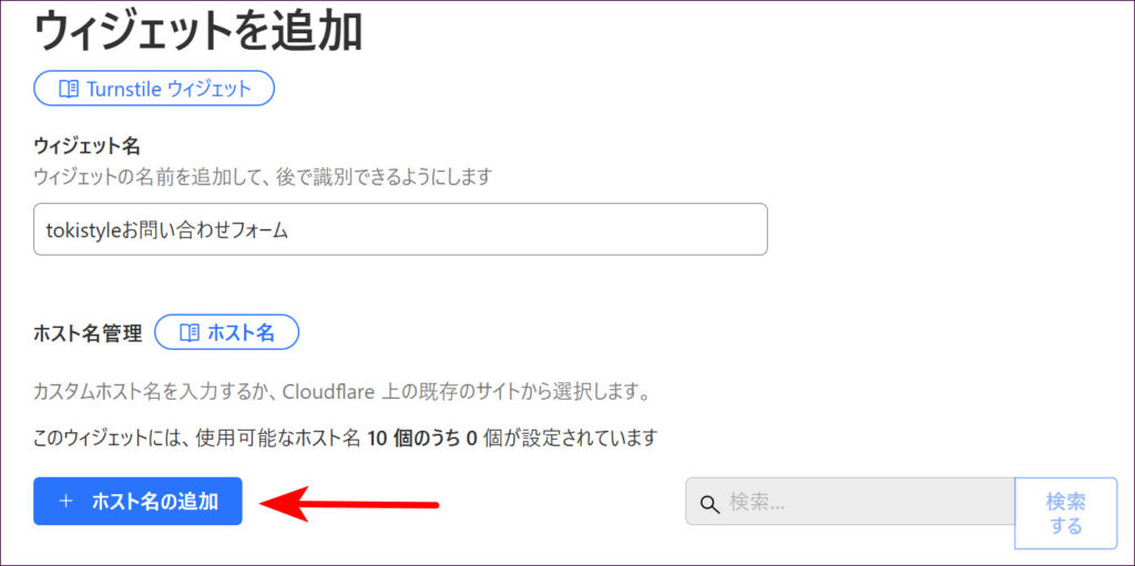 Turnstileを導入したいWordPressサイトのドメイン名を入力し、「追加」ボタンをクリックします。