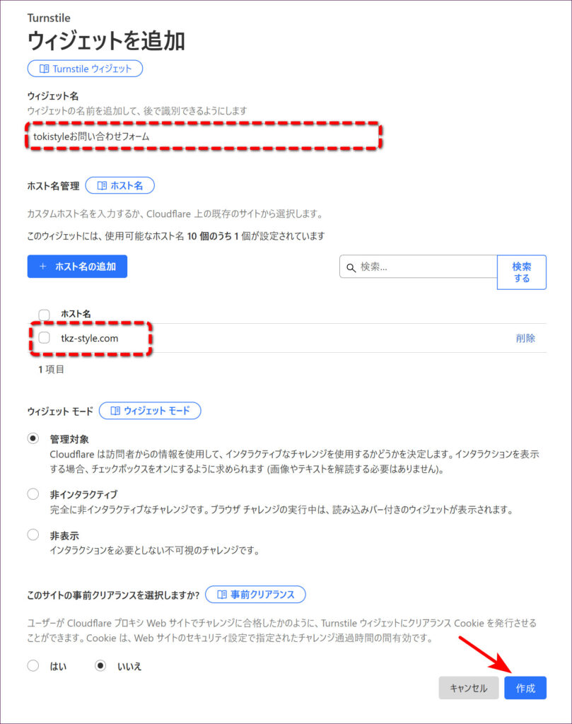 「ウィジェット名」と「ホスト名」が設定されているのを確認して、「作成」をクリックします。(ウィジェットモードや事前クリアランスはデフォルトのままで問題ありません)