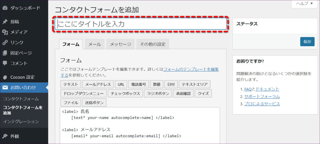 フォームの編集画面が開きます。タイトルに「お問い合わせフォーム」など、分かりやすい名前を入力しましょう。