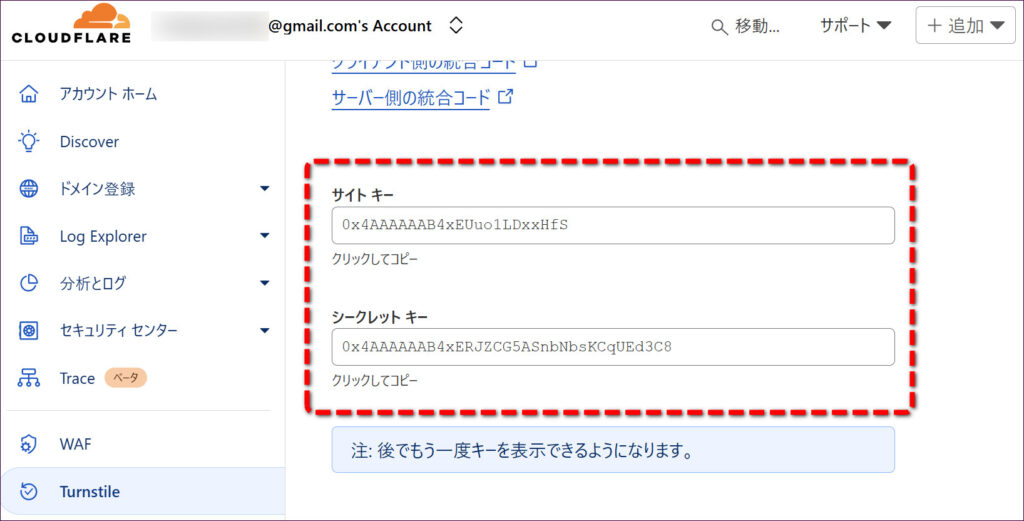 「サイトキー」と「シークレットキー」が発行されます。