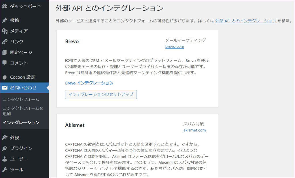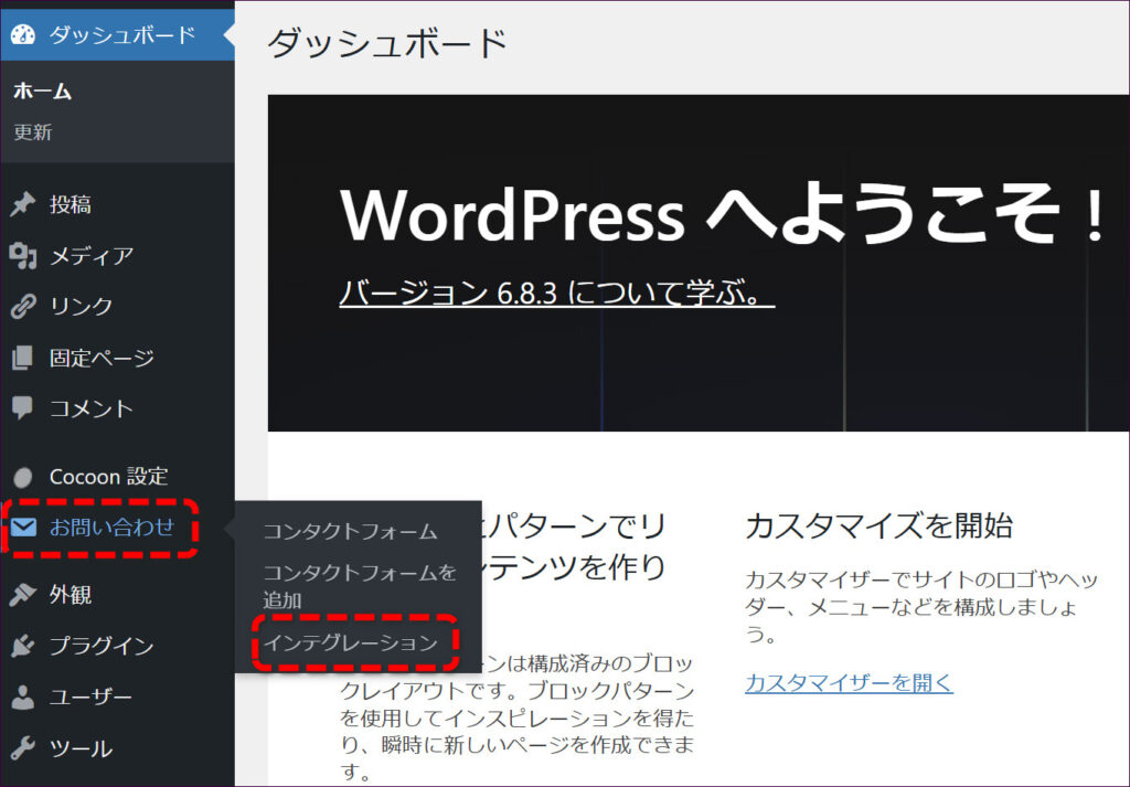 続いて、WordPressで設定を行います。画面左側「お問い合わせ」→「インテグレーション」をクリックします。