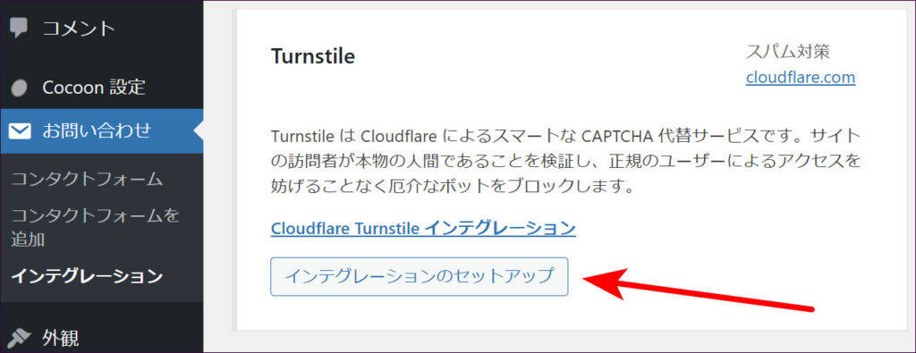 「Turnstile」について書かれている場所の「インテグレーションのセットアップ」をクリックします。