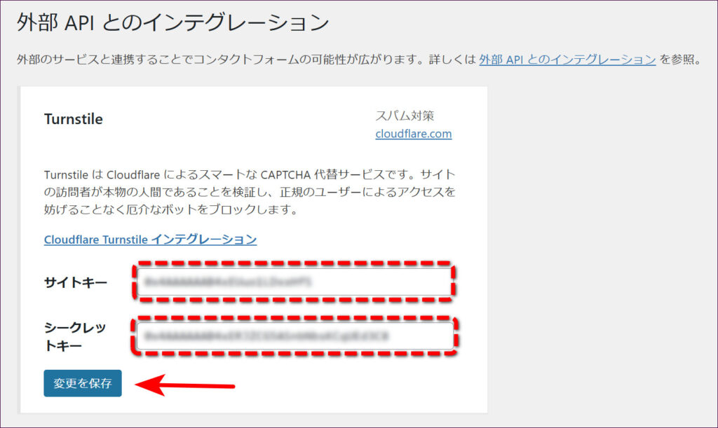 先ほどコピーしておいた「サイトキー」と「シークレットキー」を入力して、「変更を保存」をクリックします。