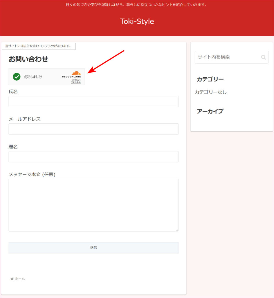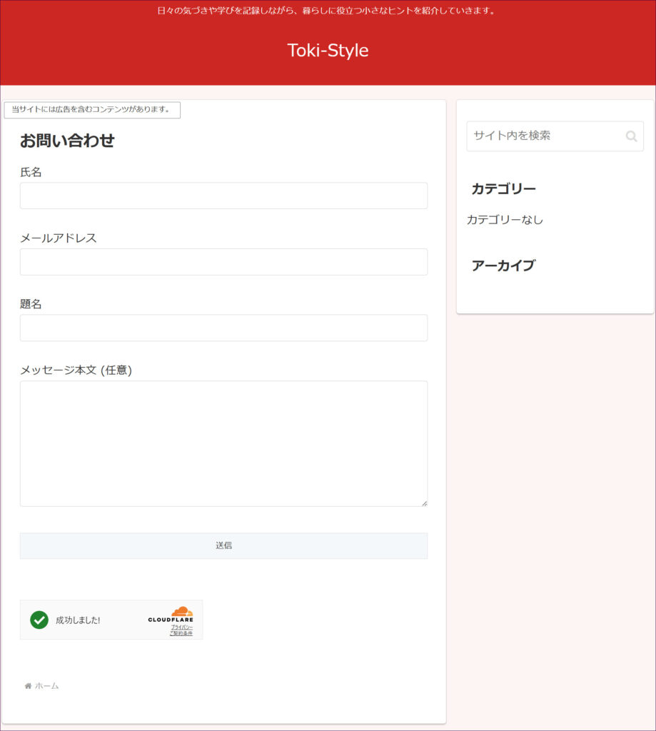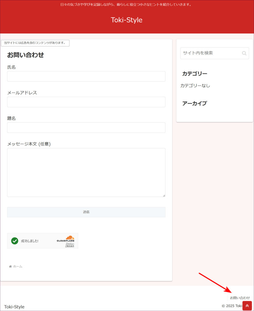 実際に、お問い合わせフォームを設置したページを開くと、このようにTurnstile のウィジェット(バッジ)がページ下部に表示されます。個人的には、このほうがデザイン的にすっきりしてよいと思っています。