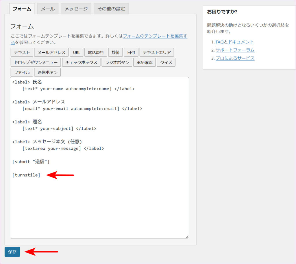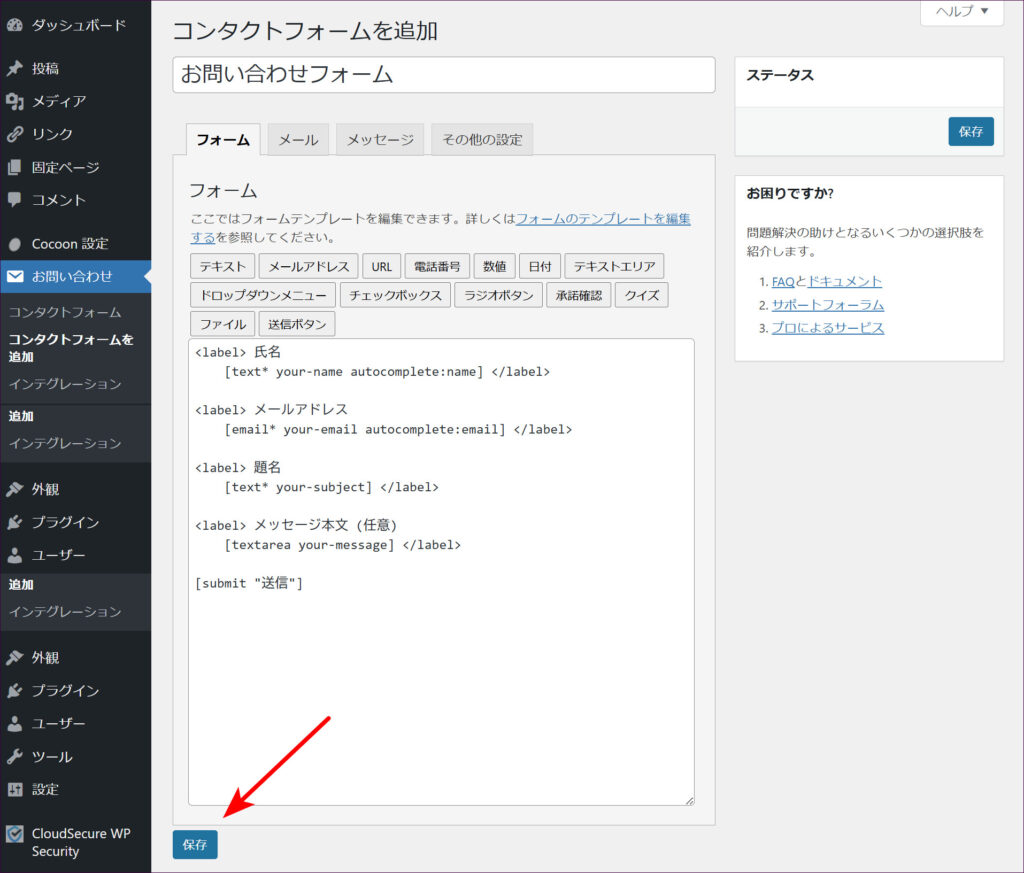 フォームの各項目は、初期設定(デフォルト)のままでも「氏名」「メールアドレス」「題名」「メッセージ本文」「送信ボタン」といった基本的なフォームとして十分機能します。まずはそのまま画面を下にスクロールし、「保存」ボタンをクリックします。