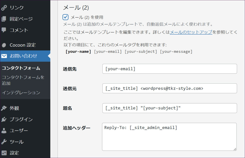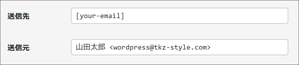 [your-email] には、ユーザーがお問い合わせフォームに入力したメールアドレスが反映されます。つまり、ユーザーが入力したメールアドレスがメールの送信先となるので、自動返信設定の場合は、ここはそのままにしておきます。