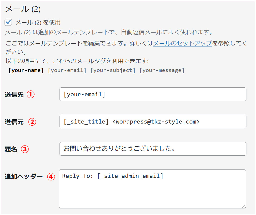 ここには、自動返信メールの送信者名としたい内容を記載します。デフォルトでは、[_site_title] となっており、[_site_title]には、一般設定で指定した「サイトのタイトル」が反映されます。つまり、何も設定をしなければ、送信者名は「サイト名」となります。