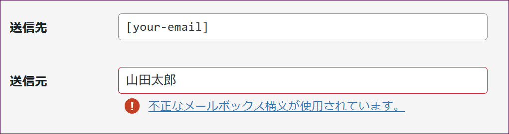 なお、このように、名前だけを記載するとエラーメッセージが出ますので、送信元として書かれているは、そのまま残しておきましょう。