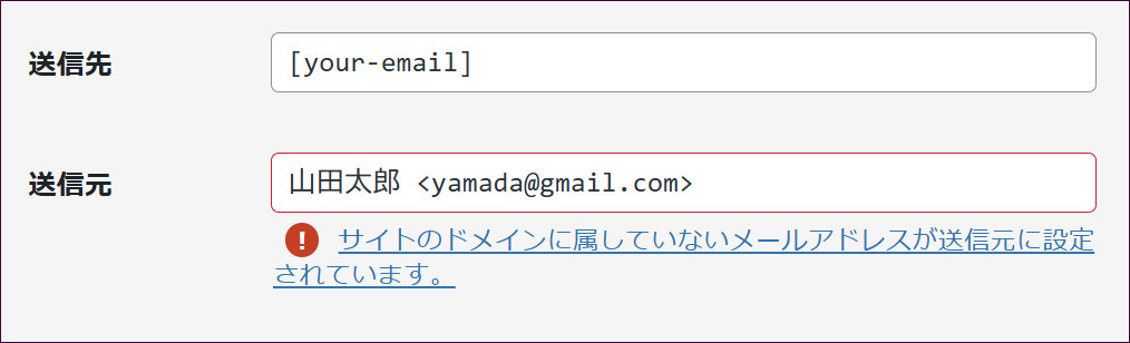 また、このように自分のGメールアドレスなどを入力してしまうケースもよくあるのですが、WordPressのドメインと違うドメイン(例:gmail.com)を記載すると、このようなエラーが出ます。