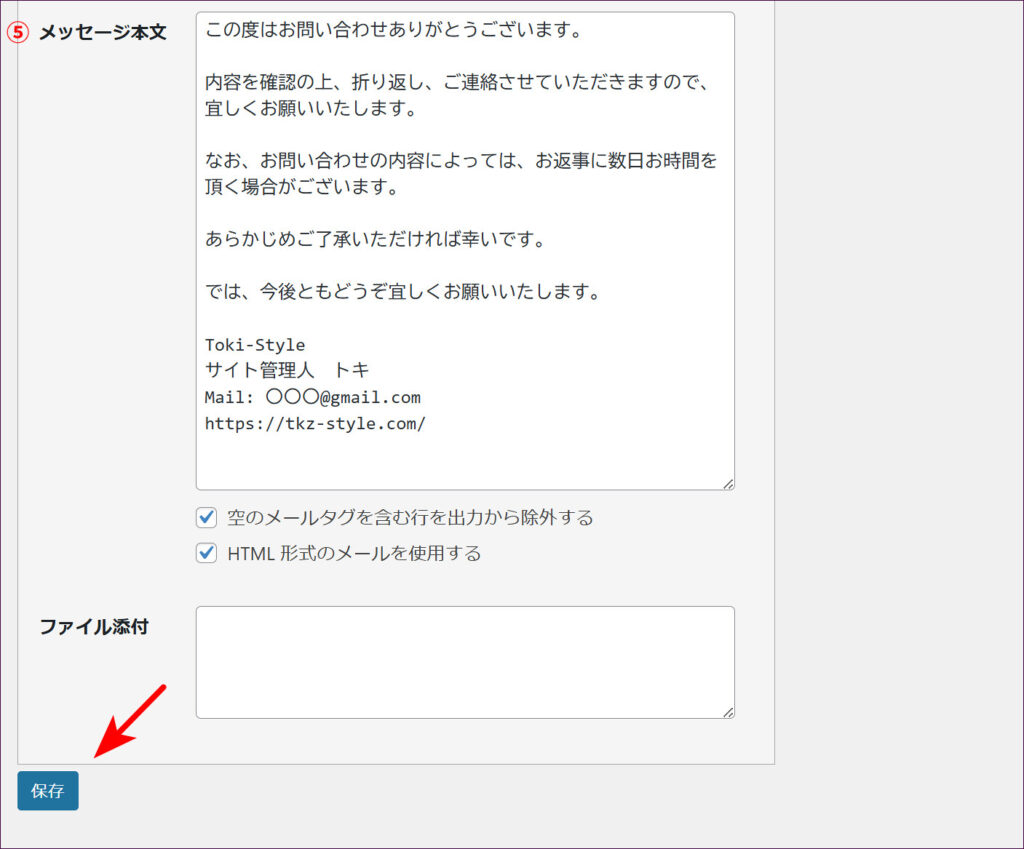 特に変更する必要はありません。[_site_admin_email]には、WordPress の管理者のメールアドレスが反映されます。