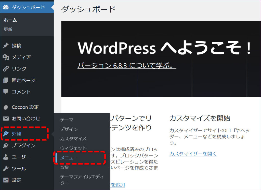 管理画面左メニュー「外観」→「メニュー」をクリックします。