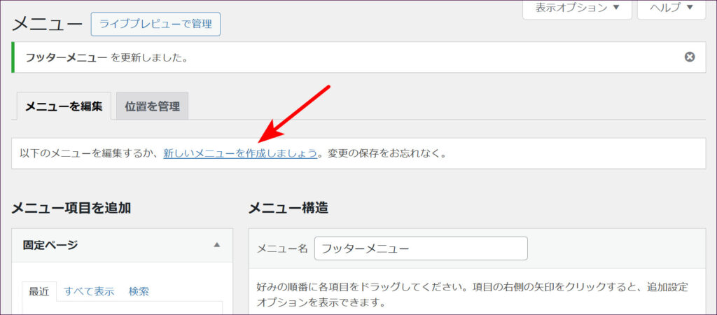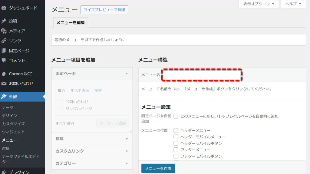 「メニューを作成」をクリックします。