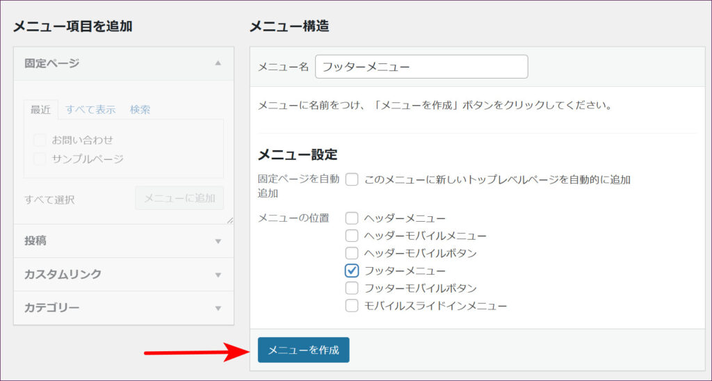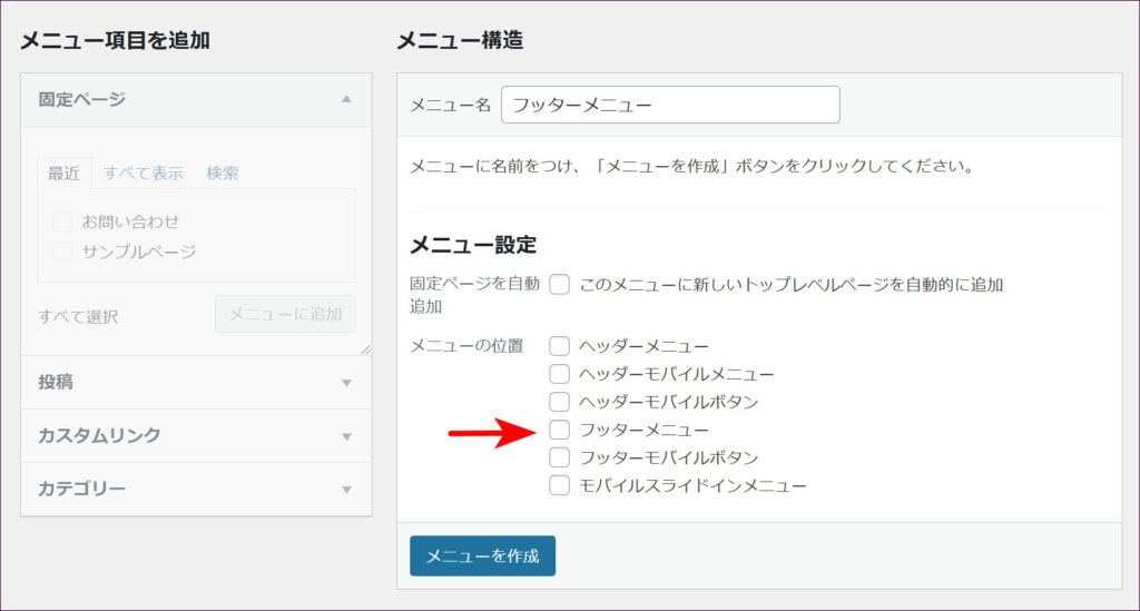 次に、「メニュー設定」の項目の「フッターメニュー」にチェックを入れます。