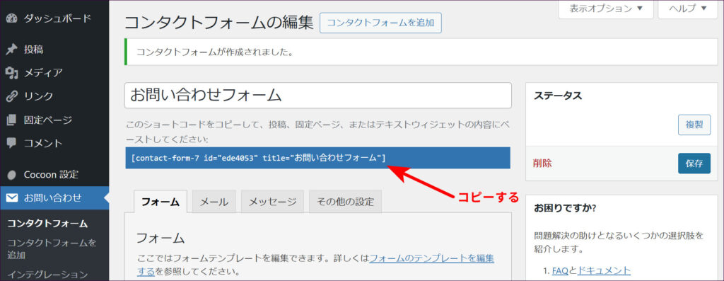 保存すると、フォームタイトルの下に青い背景のコード(ショートコード)が表示されます。このコードをコピーしてください。