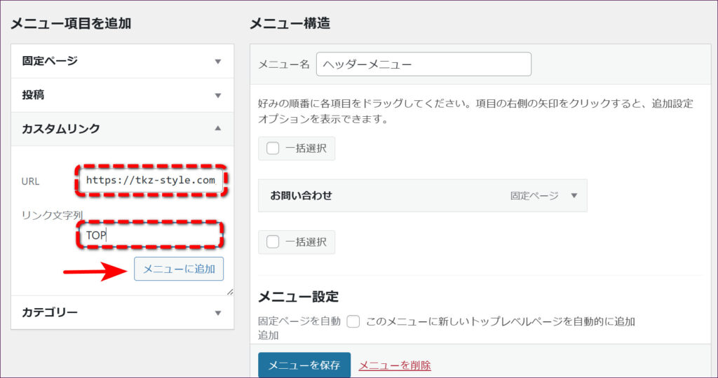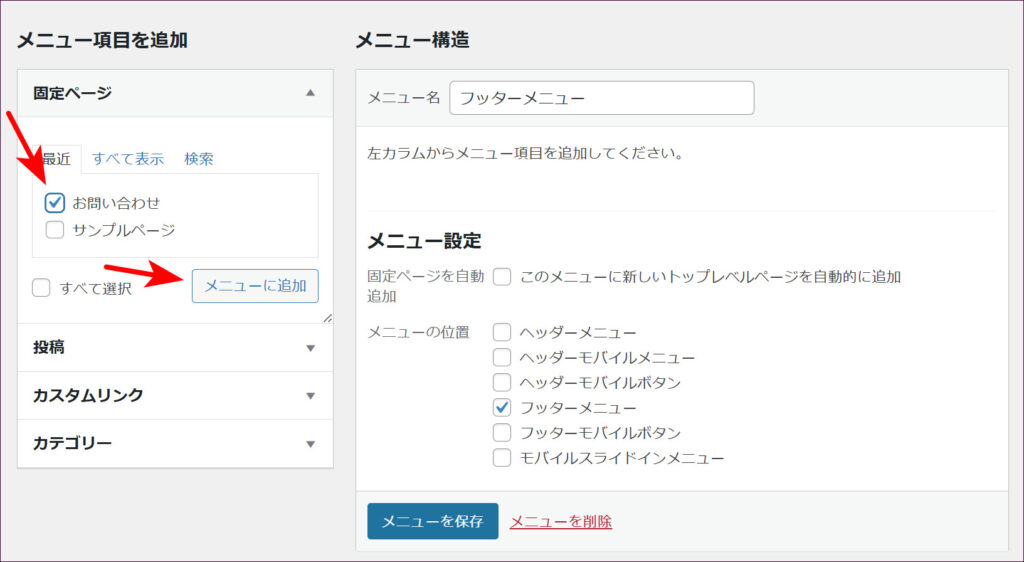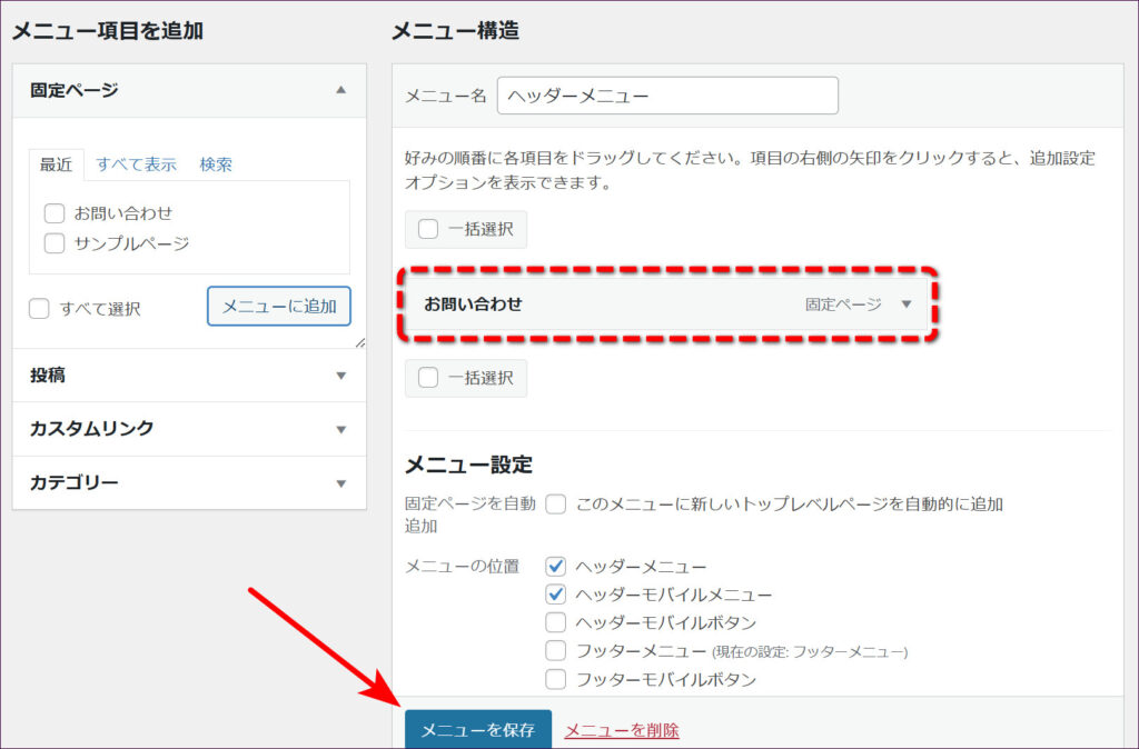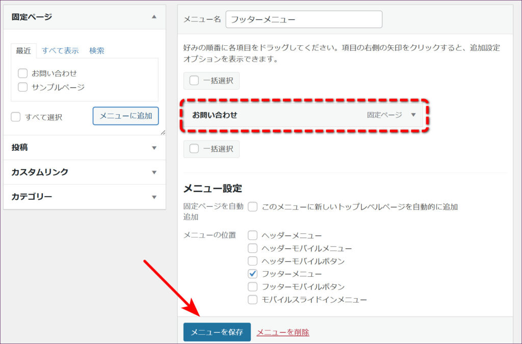 「フッターメニュー」を作成したときと同じ要領で、「お問い合わせ」をメニューに追加したら、「メニューを保存」をクリックします。