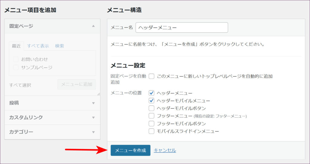 先ほど「フッターメニュー」を作成したときと同じ要領で、「ヘッダーメニュー」を作成していきます。今回、メニューの位置は「ヘッダーメニュー」と「ヘッダーモバイルメニュー」にチェックを入れています。入力が終わったら「メニューを作成」をクリックします。