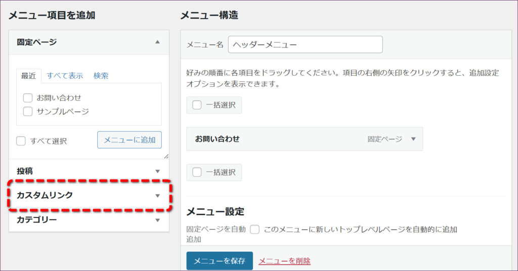 「TOP」メニューは、「カスタムリンク」を利用して作成します。