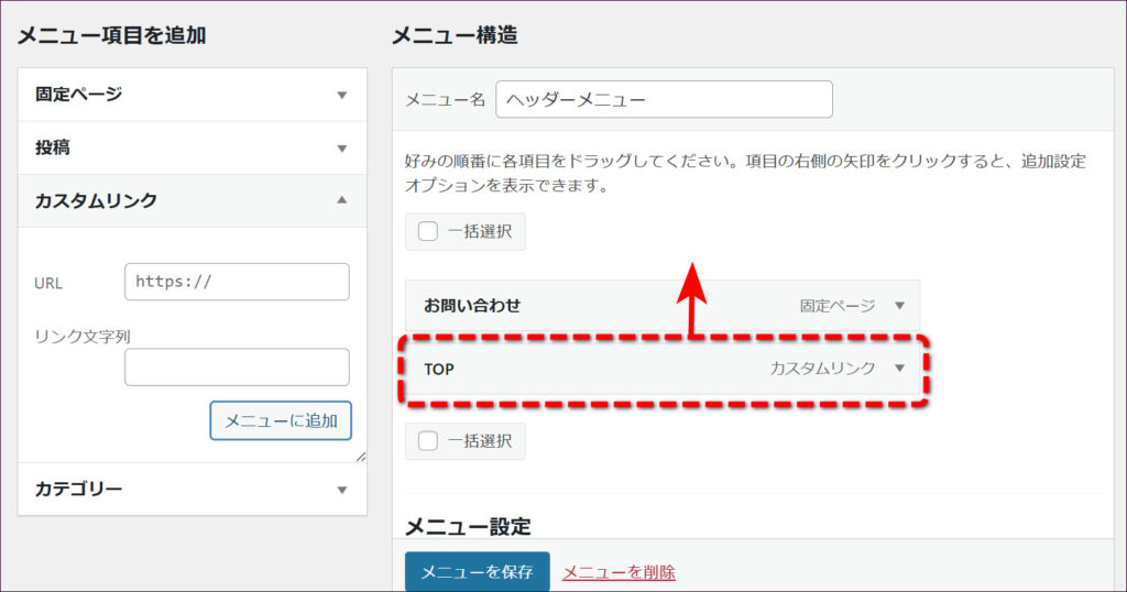 「TOP」は、一番左に表示させたいので、ドラッグ&ドロップで一番上に移動させます。